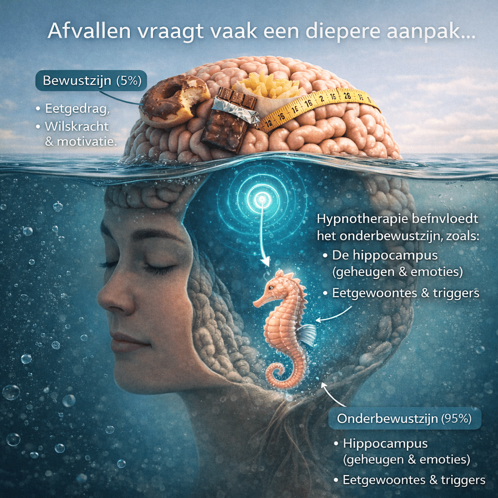 Met hypnotherapie pakken we niet alleen het symptoom (meer eten dan je wilt) aan, maar de oorzaak eronder. Zodra dat mechanisme verandert, wordt het makkelijker om automatisch andere keuzes te maken — zonder dat je constant hoeft te vechten tegen jezelf.